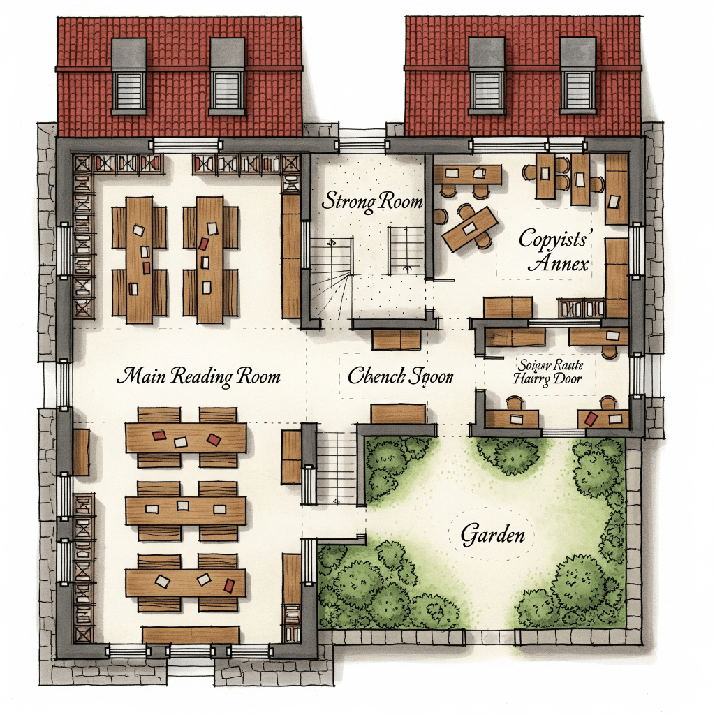La bibliothèque d’Eldoria, bien que modeste par sa taille, affichait une architecture soigneusement pensée, alliant praticité et symbolisme. Elle était implantée dans une aile d’un ancien bâtiment communal, partiellement rénové pour répondre aux besoins spécifiques du stockage des manuscrits et à la fréquentation d’érudits et de notables.