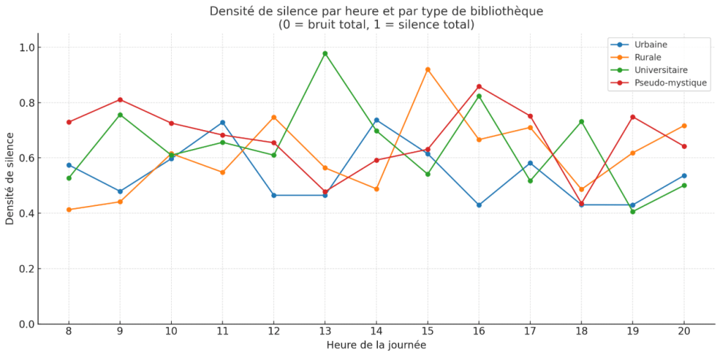 L’objectif de cette étude est de quantifier ce silence, d’évaluer sa densité et d’explorer son impact sur les lecteurs et le personnel. Nous avons choisi de ne pas détourner le regard : le silence prolongé est parfois insupportable, parfois extatique, toujours envahissant. Ici, pas de poésie romantique, pas de lyrisme contemplatif : nous observons le banal, le quotidien sonore manquant, l’ordinaire du vide auditif.